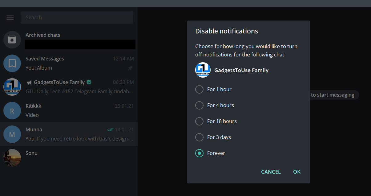 Si vous ne souhaitez pas désactiver définitivement les discussions, vous pouvez sélectionner une durée plus courte. Pour l’instant, Telegram vous permet de désactiver les discussions pendant 1 heure, 8 heures et 2 jours en plus de vous permettre de les désactiver définitivement.